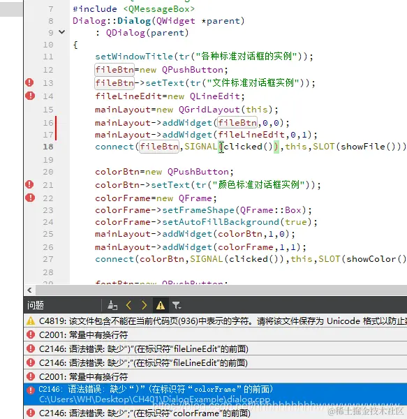 错误: error: C2001: 常量中有换行符 AI浩 2021-09-28 257 阅读1分钟 如图所示: 在使用tr()的时候出现的问题。例如: fileBtn->setText(tr("文件标准对话框实例")); 在最后一个中文和引号之间加个空格就可以解决,修改为: fileBtn->setText(tr("文件标准对话框实例 "));