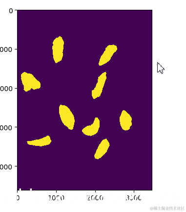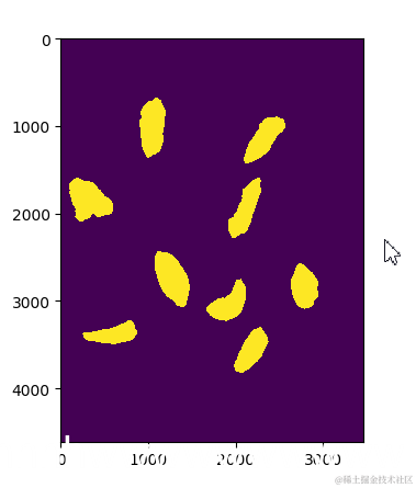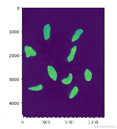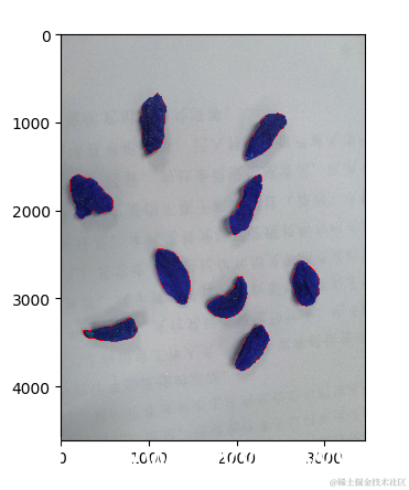 现在我们使用轮廓检测,在我们“模糊”的图像中找到枸杞。为了去除小的和无关紧要的轮廓,我们只选择那些面积大于2000的轮廓(任意值,是超参数)。