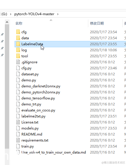 将Labelme数据集复制到pytorch-YOLOv4-master文件夹下面,如图: