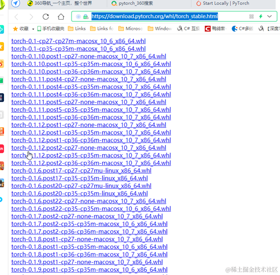如果你想要的版本,没有在这里,点击pip,就会在命令行的那个栏里看到网址:download.pytorch.org/whl/torch_s…, 将这个网址打开你就能看到所有的版本,选择自己需要的,下载下来,在本地安装。