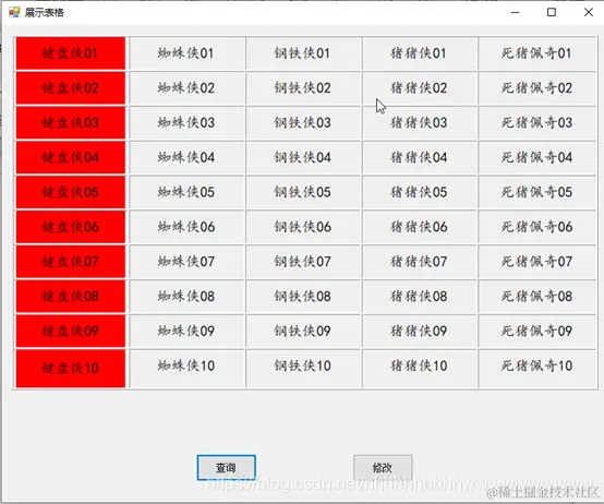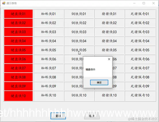AddRow("键盘侠"+i.ToString().PadLeft(2,'0'),"蜘蛛侠" + i.ToString().PadLeft(2, '0'), "钢铁侠" + i.ToString().PadLeft(2, '0'), "猪猪侠" + i.ToString().PadLeft(2, '0'), "死猪佩奇" + i.ToString().PadLeft(2, '0'));