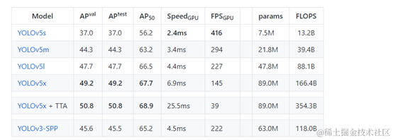 YOLOV5严格意义上说并不是YOLO的第五个版本,因为它并没有得到YOLO之父Joe Redmon的认可,但是给出的测试数据总体表现还是不错。详细数据如下: