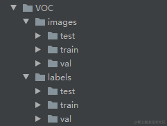 这段代码执行完成会在LabelmeData生成每个图片的txt标注数据,同时在tmp文件夹下面生成训练集、验证集和测试集的txt,txt记录的是图片的路径,为下一步生成YoloV5训练和测试用的数据集做准备。在tmp文件夹下面新建MakeData.py文件,生成最终的结果,目录结构如下图:
