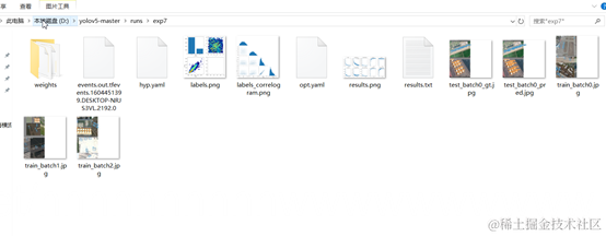 在经历了300epoch训练之后,我们会在runs文件夹下面找到训练好的权重文件和训练过程的一些文件。如图: