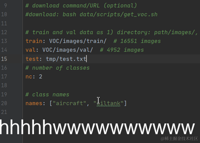 首先需要在voc.yaml中增加测试集的路径,打开voc.yaml,在val字段后面增加test: tmp/test.txt这行代码,如图: