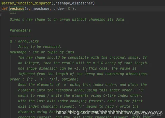 reshape() 函数: ****这个方法是在不改变数据内容的情况下,改变一个数组的格式,参数如下图: