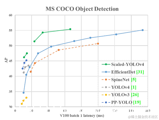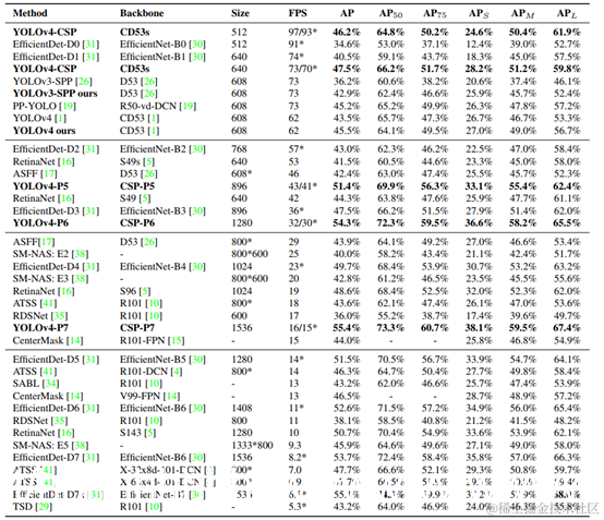 CSPDarknet53的深度、瓶颈比、龄期间宽度生长比分别为65、1和2。因此,我们开发了基于YOLOv4的模型缩放技术,提出了scale -YOLOv4。提出的缩放yolov4具有出色的性能,如下图所示: