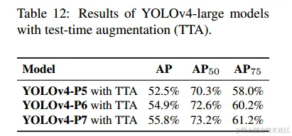 YOLOv4大型模型的测试时间增加(TTA)实验的结果显示在表12中。应用。应用TTA后,YOLOv4P5,YOLOv4-P6和YOLOv4-P7分别提高AP 1.1%,0.6%和0.4%