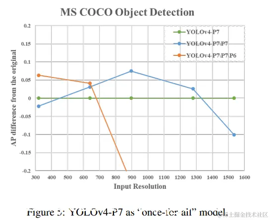 在本小节中,我们设计实验以表明类似FPN的体系结构是幼稚的“一劳永逸”的模型。在这里,我们删除了YOLOv4-P7的自顶向下路径和检测分支的某些阶段。YOLOv4-P7 \ P7和YOLOv4P7 \ P7 \ P6代表已从训练有素的YOLOv4-P7中移除了{P7}和{P7,P6}阶段的模型。图5显示了修剪后的模型与具有不同输入分辨率的原始YOLOv4-P7之间的AP差异。