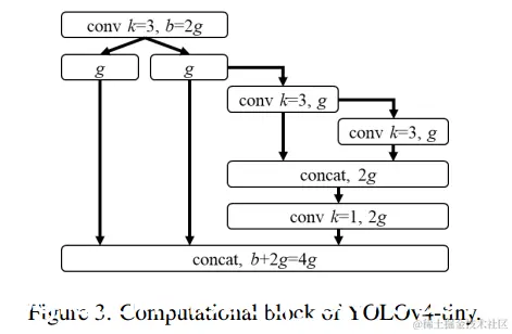我们将使用具有PCB架构的CSPOSANet来构成YOLOv4的主干。我们将g = b/2设置为增长率,最后使其增长到b/2 + kg = 2b。通过计算,我们推导出k = 3,其架构如图3所示。关于每个级和颈部部分的通道数,我们遵循YOLOv3-tiny的设计。