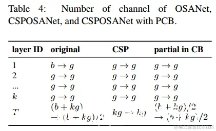 特征图的最小化/平衡大小:为了获得最佳的计算速度权衡,我们提出了一个新的概念,即在CSPOSANet的计算块之间执行梯度截断。如果我们将原始CSPNet设计应用于DenseNet或ResNet体系结构,因为这两种体系结构的第jth层输出是第1st层至第(j – 1)th层输出的集成,因此我们必须将整个计算块作为一个整体来对待。因为OSANet的计算块属于PlainNet体系结构,所以从计算块的任何层制作CSPNet都可以实现梯度截断的效果。我们使用此功能重新规划基础层的b通道和由计算块生成的kg通道,并将它们分成具有相同通道号的两条路径,如表4所示。