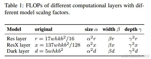 对于具有b个基本层通道的k层CNN,ResNet层的计算为k * {conv 1×1,b/4 – conv3×3,b/4–conv 1×1,b}, ResNext层为k*{conv1×1,b/ 2– gconv 3×3/32,b/2 – conv1×1,b}。对于darknet层,计算量为k * {conv1×1,b/2 – conv3×3,b}。令可用于调整图像大小,层数和通道数的缩放因子分别为α,β和γ。当这些比例因子变化时,表1总结了FLOP的相应变化。