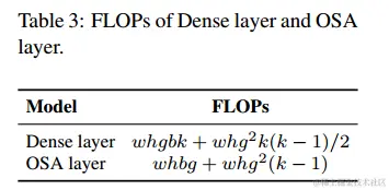 对于一般的CNN,表3中列出的g,b和k之间的关系为k << g <b。因此,DenseNet的计算复杂度顺序为O(whgbk),而OSANet的计算复杂度顺序为O(max(whbg,whkg2))。上面两者的计算复杂度顺序小于ResNet系列的O(whkb2)。因此,我们借助OSANet设计了较小的模型,该模型具有较小的计算复杂性。