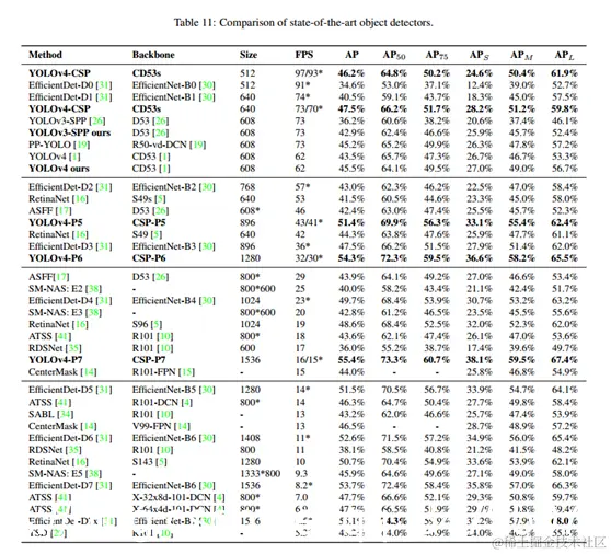 我们与其他实时对象检测器进行了比较,结果如表11所示。在[AP,AP50,AP75,APS,APM,APL]项目中以粗体标出的值表明该模型在相应的检测器中表现最佳项目。我们可以看到,所有缩放的YOLOv4模型,包括YOLOv4-CSP,YOLOv4-P5,YOLOv4-P6,YOLOv4P7,在所有指标上都是帕累托最优的。当我们将YOLOv4-CSP与EfficientDetD3的相同精度(47.5%对47.5%)进行比较时,推理速度是1.9倍。当将YOLOv4-P5与EfficientDet-D5进行相同精度的比较(51.4%对51.5%)时,推理速度