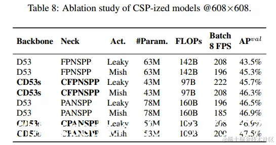 从表8中列出的数据可以看出,CSP模型化后的参数和计算量大大减少了32%,并提高了批处理8的吞吐量和AP。如果要保持相同的帧速率,则可以在CSP转换后为模型添加更多层或更多高级激活功能。从表8所示的数字中,我们可以看到CD53s-CFPNSPP-Mish和CD53sCPANSPP-Leaky与D53-FPNSPP-Leaky具有相同的批处理8吞吐量,但是在计算量较低的情况下,它们的AP改善分别为1%和1.6% 资源。从上面的改进数字中,我们可以看到模型CSP带来的巨大优势。因此,我们决定使用CD53s-CPANSPP-Mish,它将表8中最高的AP用作YOLOv4-CSP的主干。