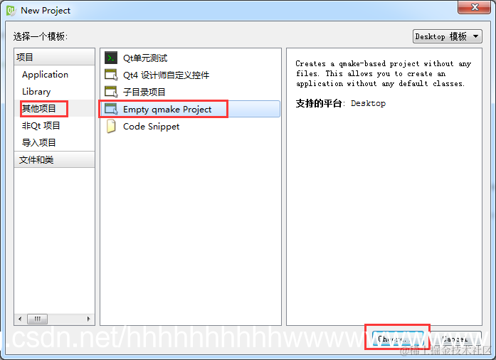 选择【choose】进行下一步。设置项目名称和路径 —> 选择编译套件 --> 修改类信息 --> 完成(步骤同上),生成一个空项目。在空项目中添加文件:在项目名称上单击鼠标右键弹出右键菜单,选择【添加新文件】