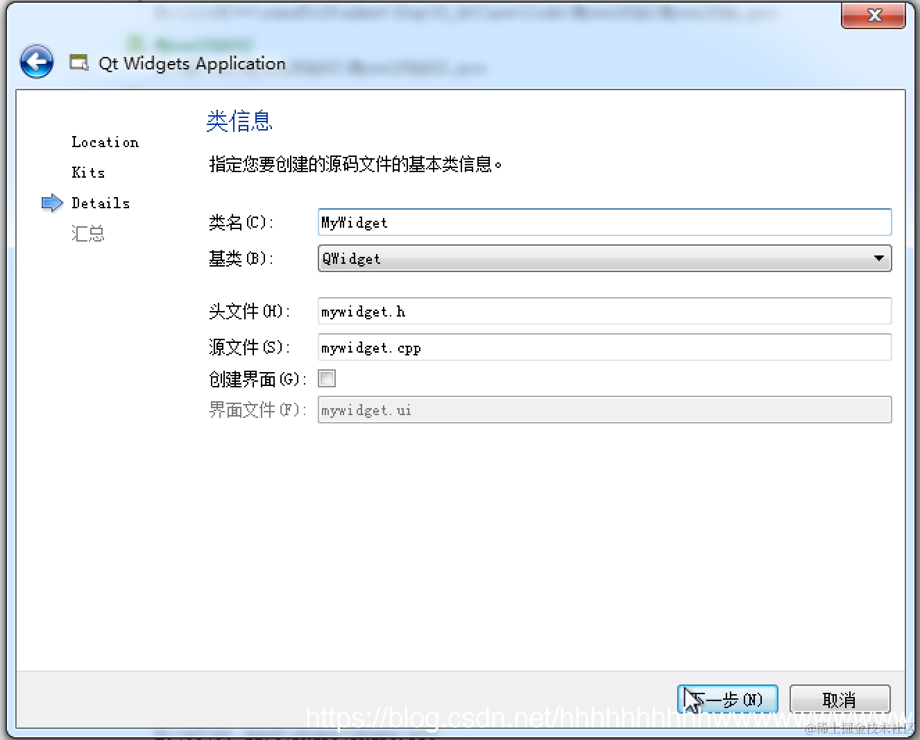 向导会默认添加一个继承自CMainWindow的类,可以在此修改类的名字和基类。默认的基类有QMainWindow、QWidget以及QDialog三个,我们可以选择QWidget(类似于空窗口),这里我们可以先创建一个不带UI的界面,继续下一步