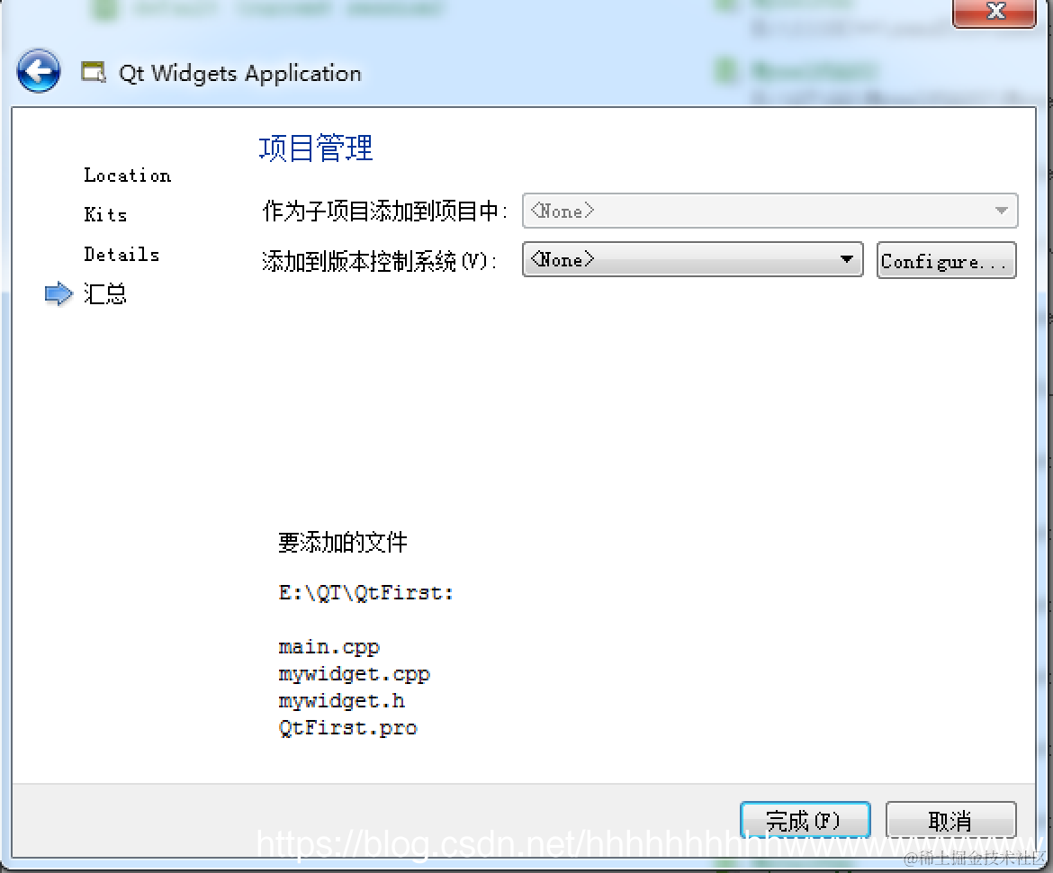 系统会默认给我们添加main.cpp、mywidget.cpp、 mywidget.h和一个.pro项目文件,点击完成,即可创建出一个Qt桌面程序。