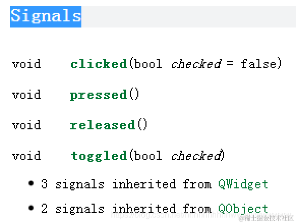 那么系统自带的信号和槽通常如何查找呢,这个就需要利用帮助文档了,在帮助文档中比如我们上面的按钮的点击信号,在帮助文档中输入QPushButton,首先我们可以在Contents中寻找关键字 signals,信号的意思,但是我们发现并没有找到,这时候我们应该想到也许这个信号的被父类继承下来的,因此我们去他的父类QAbstractButton中就可以找到该关键字,点击signals索引到系统自带的信号有如下几个