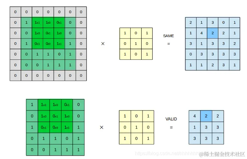 卷积层(Convolution Layer)通常用作对输入层输入数据进行特征提取,通过卷积核矩阵对原始数据中隐含关联性的一种抽象。卷积操作原理上其实是对两张像素矩阵进行点乘求和的数学操作,其中一个矩阵为输入的数据矩阵,另一个矩阵则为卷积核(滤波器或特征矩阵),求得的结果表示为原始图像中提取的特定局部特征。下图表示卷积操作过程中的不同填充策略,上半部分采用零填充,下半部分采用有效卷积(舍弃不能完整运算的边缘部分)。