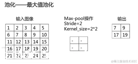 池化操作没有用于训练的参数,只有两个超参数Stride和kernel_size,过程与卷积操作类似,也是在输入图像上从左到右从上到下滑动,在滑动过程中,当核覆盖在一个区域的时候,用这个区域的最大值作为结果,Stride和kernel_size一般来说相等。