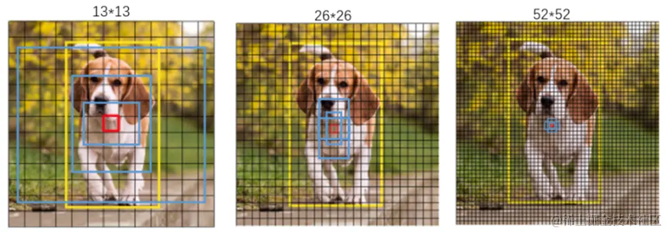 注:每个格子上的3个预测框是,我们通过聚类得到的9个框,平均分配到y1,y2,y3这三个map上,每个map的格子就是3个预测框了,