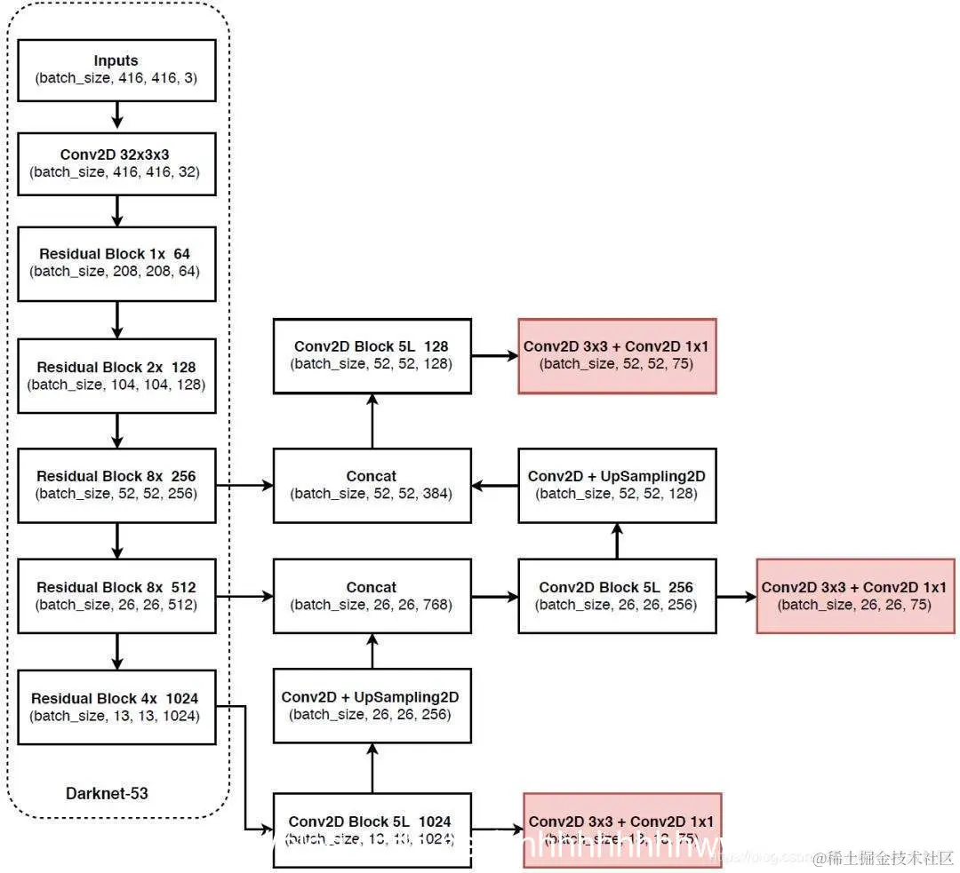 下面这张图展示了,图像从输入到输出,每个阶段的大小,三个红色的框是对应y1,y2,y3的输出。