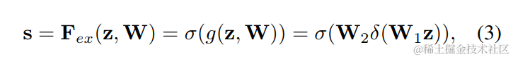 再接下来就是Excitation操作,如公式3。直接看最后一个等号,前面squeeze得到的结果是z,这里先用W1乘以z,就是一个全连接层操作,W1的维度是C/r * C,这个r是一个缩放参数,在文中取的是16,这个参数的目的是为了减少channel个数从而降低计算量。又因为z的维度是1*1*C,所以W1z的结果就是1*1*C/r;然后再经过一个ReLU层,输出的维度不变;然后再和W2相乘,和W2相乘也是一个全连接层的过程,W2的维度是C*C/r,因此输出的维度就是1*1*C;最后再经过sigmoid函数,得到s: