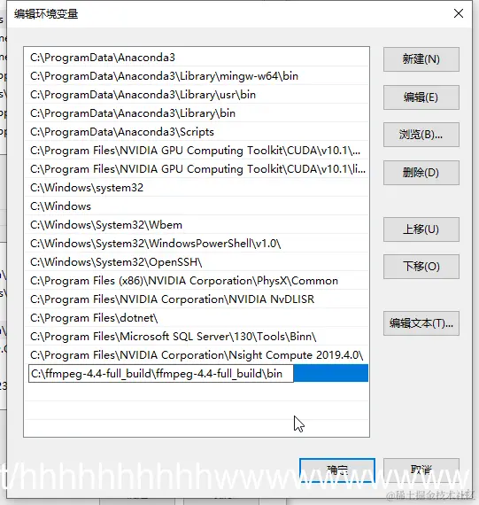 C:\ffmpeg-4.4-full_build\ffmpeg-4.4-full_build\bin,将该bin目录添加到系统环境变量中。