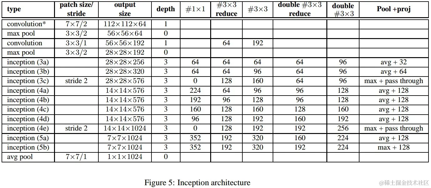 两个 Inception 模块间不再使用 pooling 层;而在模块 3c 和 4e 中的 concatenation 前采用了 stride-2 conv/pooling 层.