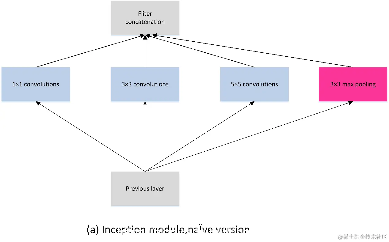 Inception_v1在同一层中采用不同的卷积核,并对卷积结果进行合并; 下面的两张图展示Inception_v1采用的两种卷积模块a和b。