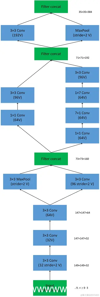 Inception_v3则在v_2基础上进行深度组合的尝试,输入改为299×299×3。