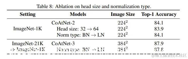 最后,我们研究了模型细节的两种选择,即每个注意力(默认为 32)头部的维度以及 MBConv 块中使用的归一化类型(默认为 BatchNorm)。 从表 8 中,我们可以看到将头部大小从 32 增加到 64 会略微影响性能,尽管它实际上可以显着提高 TPU 速度。 在实践中,这将是一种可以做出的质量与速度的权衡。 另一方面,BatchNorm 和 LayerNorm 的性能几乎相同,而 BatchNorm 在 TPU 上快 10 - 20%,具体取决于每核批量大小。