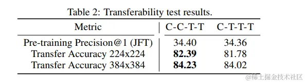 最后,为了在 C-C-T-T 和 C-T-T-T 之间做出决定,我们进行了另一个可转移性测试3——我们在 ImageNet-1K 上对上述两个 JFT 预训练模型进行了 30 次微调,并比较了它们的转移性能。 从表 2 中可以看出,尽管具有相同的预训练性能,但 C-C-T-T 的传输精度明显优于 C-T-T-T。