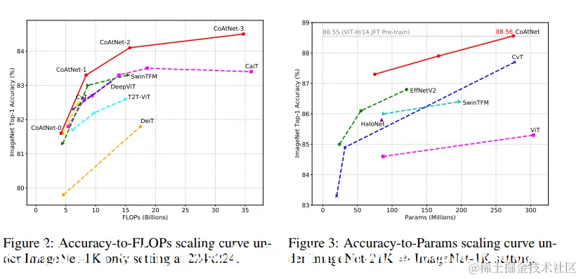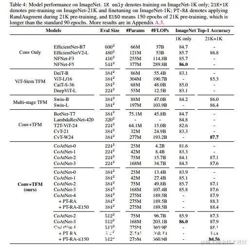 虽然我们的工作也属于这一类,但我们表明我们的相对注意力实例是深度卷积和基于内容的注意力的自然混合,附加成本最低。 更重要的是,从泛化和模型容量的角度出发,我们采用系统的方法进行垂直布局设计,并展示不同的网络阶段如何以及为什么喜欢不同类型的层。 因此,与简单地使用现成的 ConvNet 作为茎层的模型相比,例如 ResNet-ViT [13],CoAtNet 在整体尺寸增加时也会缩放卷积阶段(S2)。 另一方面,与采用局部注意力[22, 21] 的模型相比,CoAtNet 始终对 S3 和 S4 使用完全注意力来确保模型容量,因为 S3 占据了大部分计算和参数。