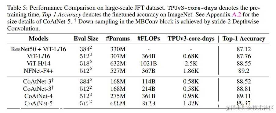 ImageNet-21K 从表 4 和图 3 中我们可以看出,当使用 ImageNet-21K 进行预训练时,CoAtNet 的优势变得更加明显,明显优于之前所有的模型。 值得注意的是,最好的 CoAtNet 变体实现了 88.56% 的 top-1 准确率,与 88.55% 的 ViTH/14 性能相匹配,这需要在 23 倍大的专有弱标记数据集 (JFT) 上对 2.3 倍大的 ViT 模型进行预训练 2.2 x 更多步骤。 这标志着数据效率和计算效率的显着提高。 JFT 最后,在表 5 中,我们使用 JFT 在大规模数据机制下进一步评估了 CoAtNet。 令人鼓舞的是,我们的 CoAtNet-4 几乎可以与 NFNet-F4+ 设置的 JFT 相媲美,同时在 TPU 训练时间和参数数量方面效率提高 2 倍。 当我们扩大模型以消耗与 NFNet-F4+ 类似的训练资源时,CoAtNet 在 top-1 准确率上达到 89.77%,在可比设置下优于之前的结果。