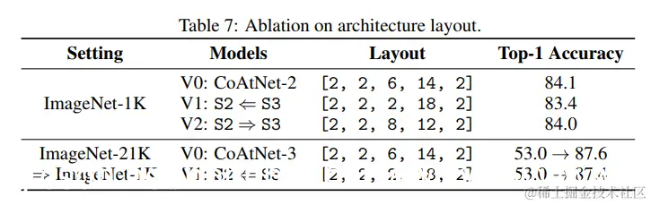 其次,由于带有 MBConv 块的 S2 和带有相关 Transformer 块的 S3 占据了 CoAtNet 的大部分计算,所以要问的问题是如何拆分 S2(MBConv)和 S3(Transformer)之间的计算以获得良好的性能。 在实践中,它归结为决定每个阶段的块数,我们将其称为“布局”设计。 为此,我们比较了我们在表 7 中试验过的几种不同布局。