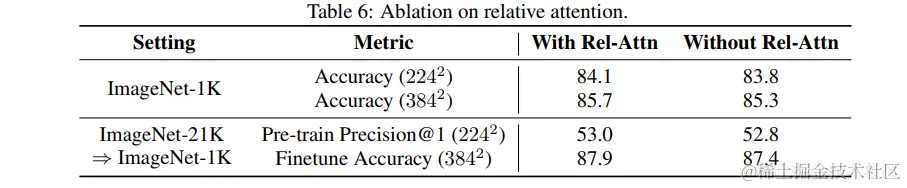 首先,我们研究了将卷积和注意力结合到单个计算单元中的相对注意力的重要性。 具体来说,我们比较了两种模型,一种具有相对注意力 另一个没有,在单独的 ImageNet-1K 和 ImageNet-21K 传输设置下。 从表 6 可以看出,当仅使用 ImageNet-1K 时,相对注意力明显优于标准注意力,表明具有更好的泛化能力。 此外,在 ImageNet-21K 传输设置下,相对注意力变量实现了明显更好的传输精度,尽管它们 非常接近的训练前表现。 这表明视觉处理中相对注意力的主要优势不是更高的容量,而是更好的概括。