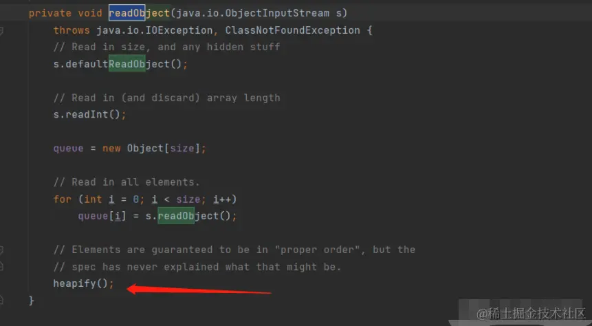 (1)最后总结一下。我们首先是在重构的PriorityQueue.readObject里面找到了heapify()方法。