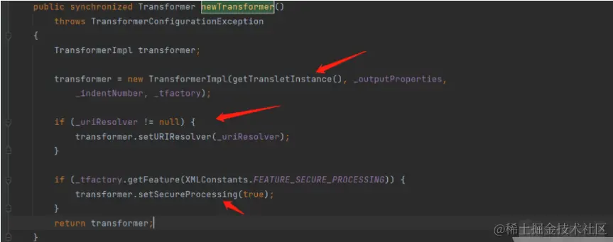(3)newTransformer()->getTransletInstance()->defineTransletClasses()->loader.defineClass(_bytecodes[i]) ->_class[_transletIndex].newInstance(),通过这里,我们能将利用javassist动态生成的类的字节码传入到其中,实例化一个类调用我们定义的方法,造成任意命令执行。