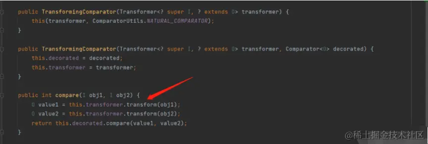 看看这个类有哪些东西。卧槽?compare()方法里调用了transform,然后 this.transformer构造方法赋值我们可控。可真是小刀划屁股,着实让人开了眼。