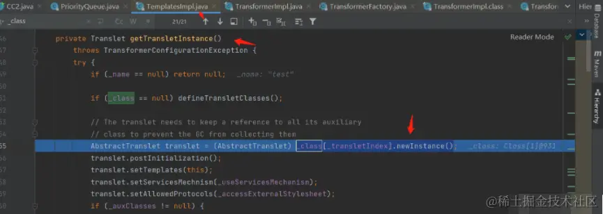 来看看构造完成后,在getTransletInstance()调用了newInstance()完成了类的实例化,执行了我们的恶意代码。