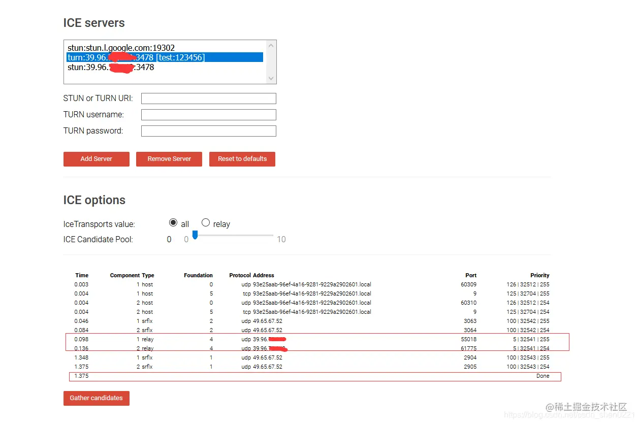 先通过Add Server添加STUN、TURN地址,选中其中一个服务,点击Gather candidates进行测试,看看有没有返回relay。 ==这边使用Firefox浏览器,Chrome浏览器测试提示有错误,如知原因,还请告知。==