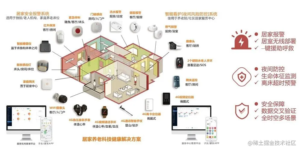 为此,云巢加速器提供了相对完备的硬件解决方案,打通硬件定制研发的各个环节,完全围绕ISV业务场景定制硬件。 以下图的居家养老科技解决方案为例,从门磁感应、烟雾报警到房间内的红外探测、起夜感应灯,以及老人佩戴的血氧手表、胸卡定位器,都可以针对具体需求和场景定制。