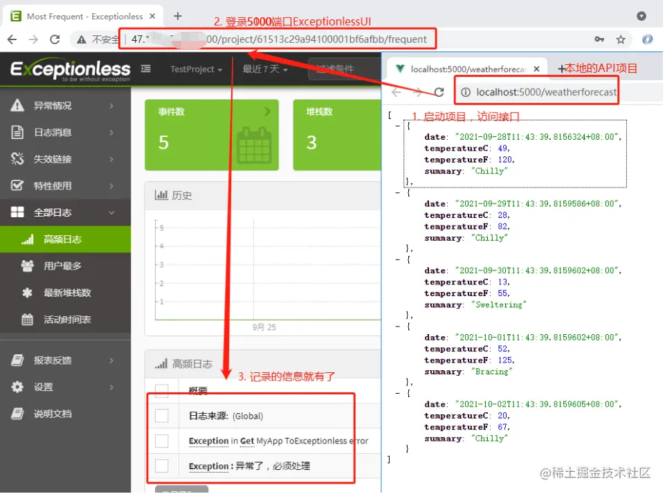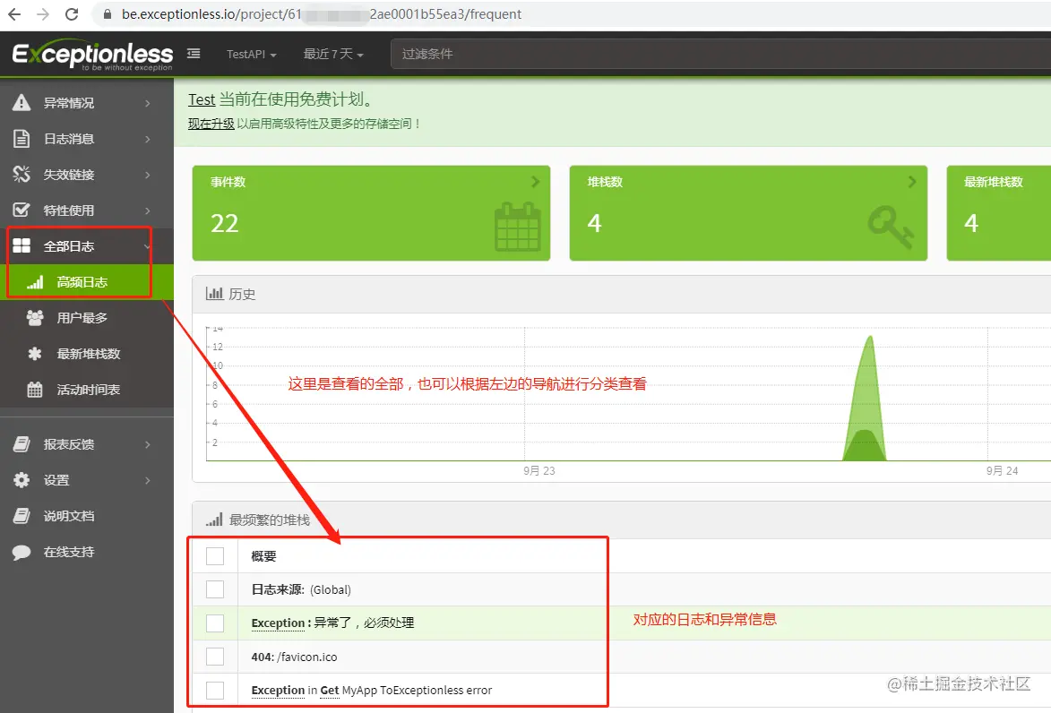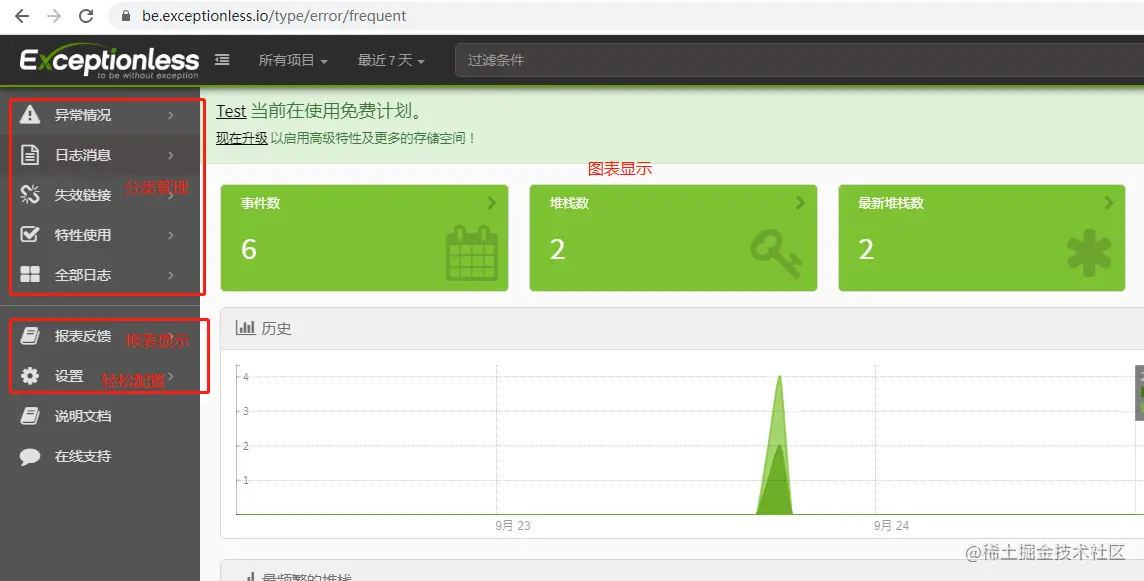 看效果,登录进官网(exceptionless.com/),就会看到对应的异常信息了,如下: