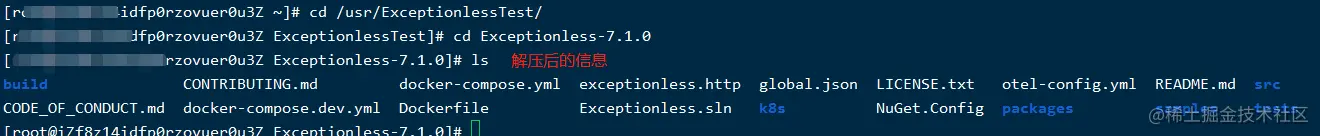 Exceptionless提供Docker安装版,这里先以Dockerfile形式演示,Docker Compose就一样的道理,只是分开容器部署更方便了。现在先直接下载(github.com/exceptionle…),推荐7.1.0版本,7.1.1的折腾了我好久,要么脚本执行不成功,要么缺少文件;然后拷贝到对应的Docker主机上解压,如下: