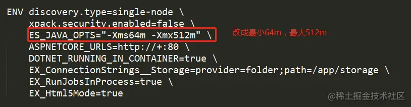 Dockerfile 把对应的Exceptionless UI、Elasticsearch等都安装在内部了,由于我的云服务内存比较小(内存大的可以不改),Dockerfile文件中默认指定了Elasticsearch最小使用内存为1G,如果内存不够,就会报错空间不足,所以稍微改动一下Dockerfile,如下: