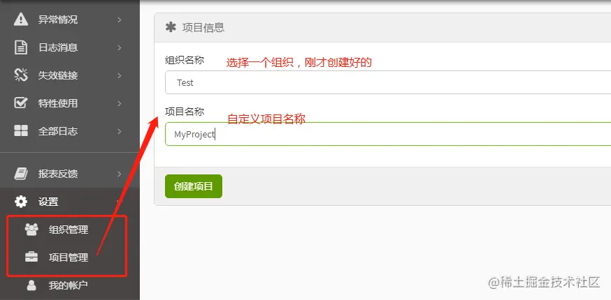 登录Exceptionless UI系统(http://IP:5000/)进去之后就创建组织和项目,和托管的步骤差不多: