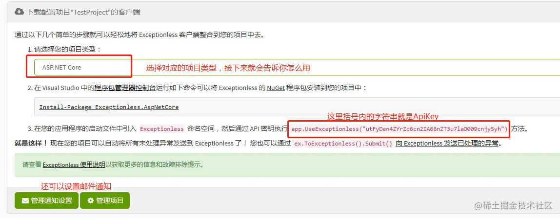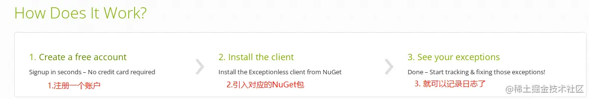 这种方式只需要在Exceptionless官网(exceptionless.com/)注册一个账号即可,存储那些都不用管,比较省心,简单三步走就能完成日志收集,如下: