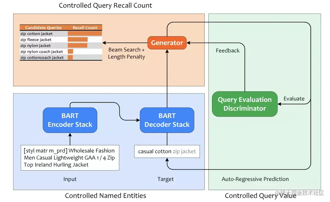 该技术框架其中分为三个模块,首先是基于 BART 训练条件语言模型,使得模型能够根据 control codes 来生成对应实体的 query,实现实体类型可控;其次是召回数量可控,在 Beam Search 采样阶段不仅考虑候选集中元素的似然得分,并考虑上各元素的长度惩罚,使得模型能够采样出更相关、更符合表达习惯且更精炼的 query,从而能够带来更多召回;最后是 Query 价值判别模型,将生成的 Query 输入判别模型获得价值得分后反馈给生成器,从而生成潜在转化价值更高的 query。